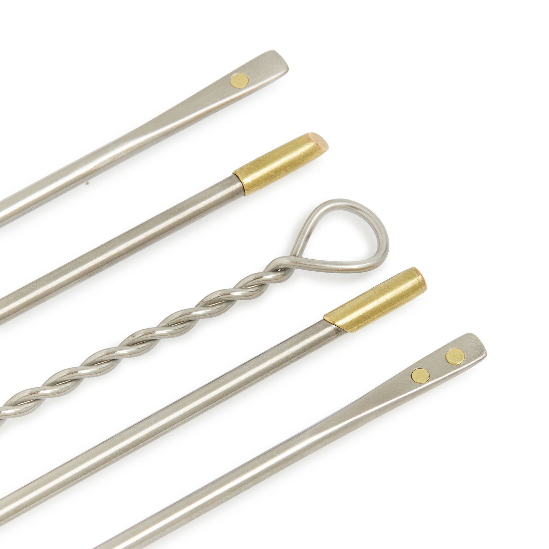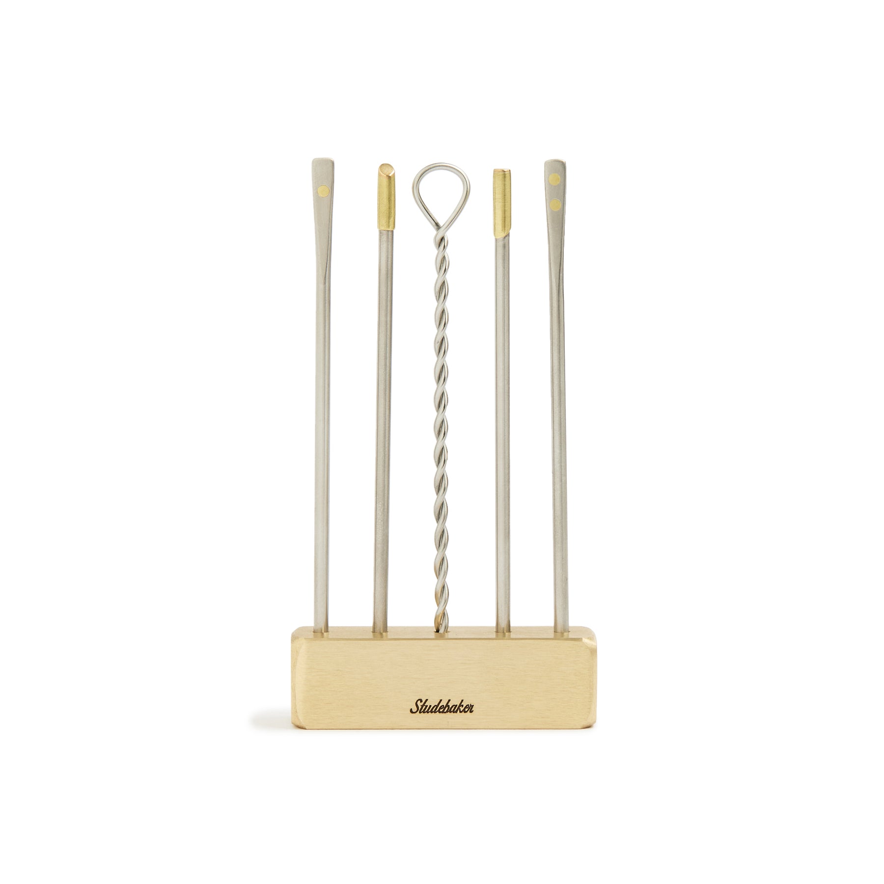 Set of 5 brass + 316L stainless steel cocktail picks with weighted display base